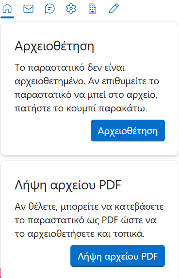 • Αρχειοθέτηση: Δυνατότητα αρχειοθέτησης παραστατικού, για ευκολία στην αναζήτηση. Χρησιμοποιείται στα φίλτρα αναζήτησης.