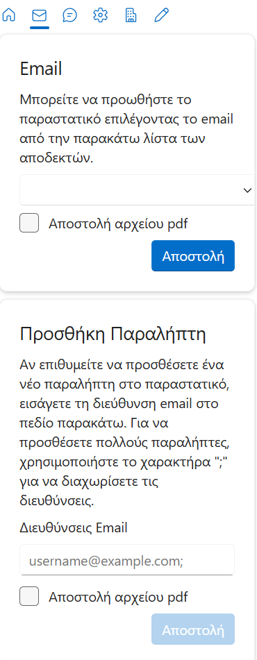 • Email: Δυνατότητα επαναποστολής του παραστατικού και επισύναψης αρχείου pdf. Η επαναποστολή μπορεί να γίνει μόνο στα emails που έχουν προστεθεί στο πεδίο accountingDepartmentEmails.