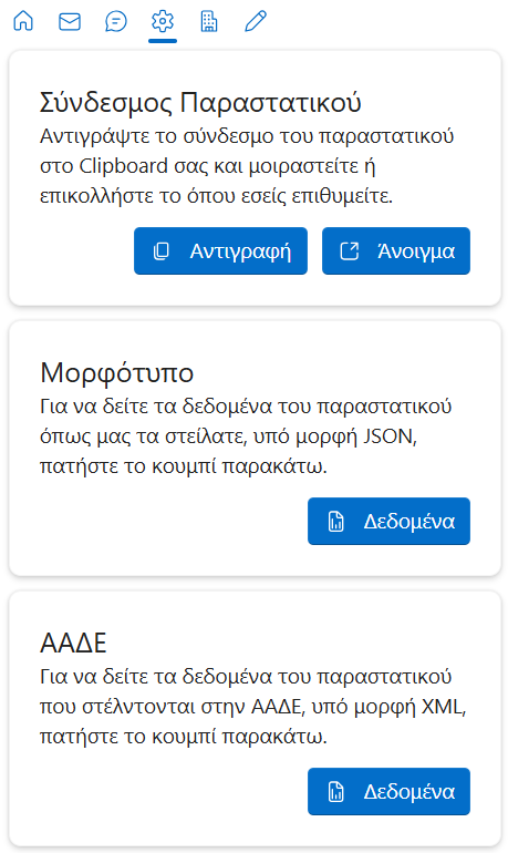 • Σύνδεσμος ΠαραστατικούΑντιγράψτε το σύνδεσμο του παραστατικού στο Clipboard σας και μοιραστείτε ή επικολλήστε το όπου εσείς επιθυμείτε. Στον δημόσιο σύνδεσμο του παραστατικού δίνονται οι δυνατότητες: