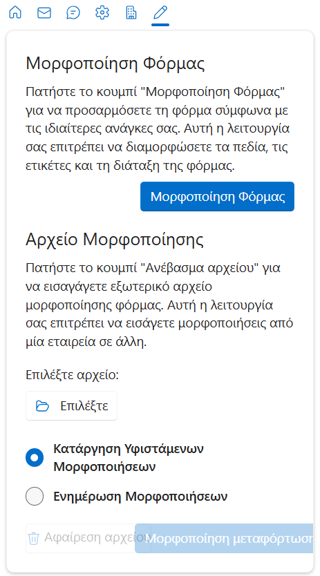 Μορφοποίηση Φόρμας: Το portal του παρόχου παρέχει την δυνατότητα στον χρήστη, να προσαρμόσει τη φόρμα σύμφωνα με τις ιδιαίτερες ανάγκες της επιχείρησής του. Αυτή η λειτουργία επιτρέπει την διαμόρφωση των πεδίων, τις ετικέτες και τη διάταξη της φόρμας.