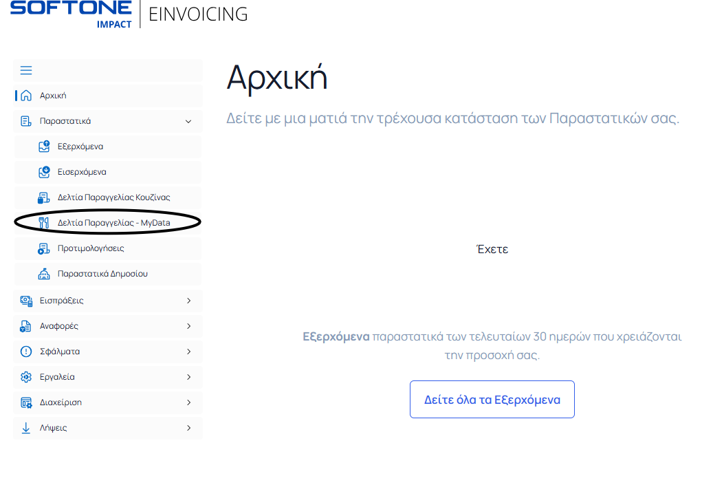 - Στην αρχική σελίδα του Portal και συγκεκριμένα στο tab Παραστατικά επιλέγετε «Δελτία Παραγγελίας-My Data».