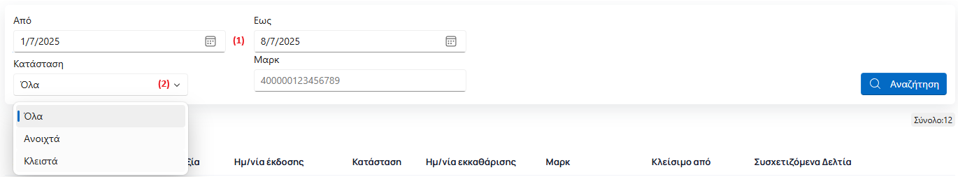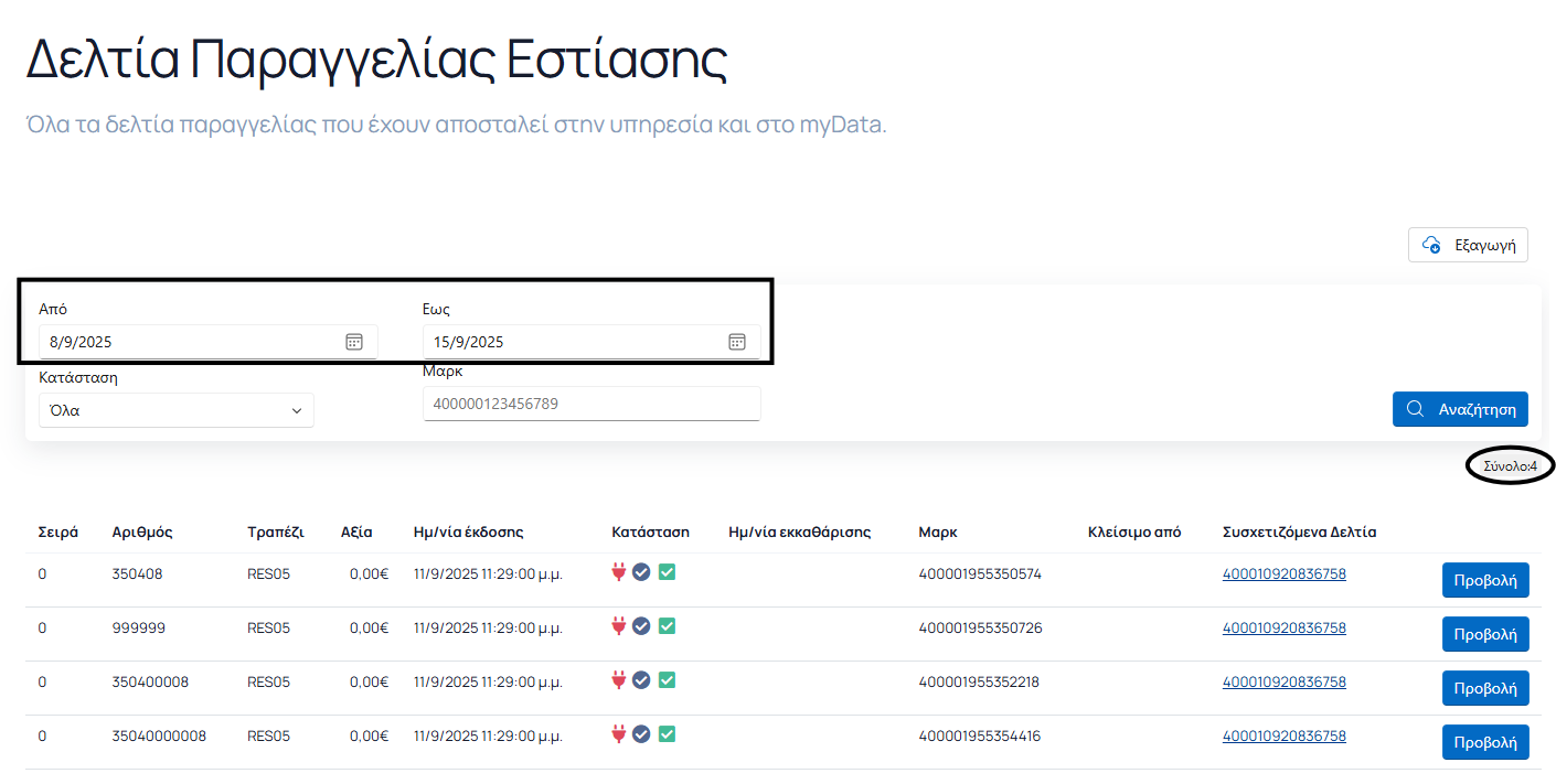 - Στη νέα σελίδα εμφανίζονται, από προεπιλογή, όλα τα Δελτία Παραγγελίας που έχουν εκδοθεί τις τελευταίες επτά (7) ημέρες, ανεξαρτήτως κατάστασης (Ανοιχτά ή Κλειστά), καθώς και το συνολικό πλήθος αυτών.